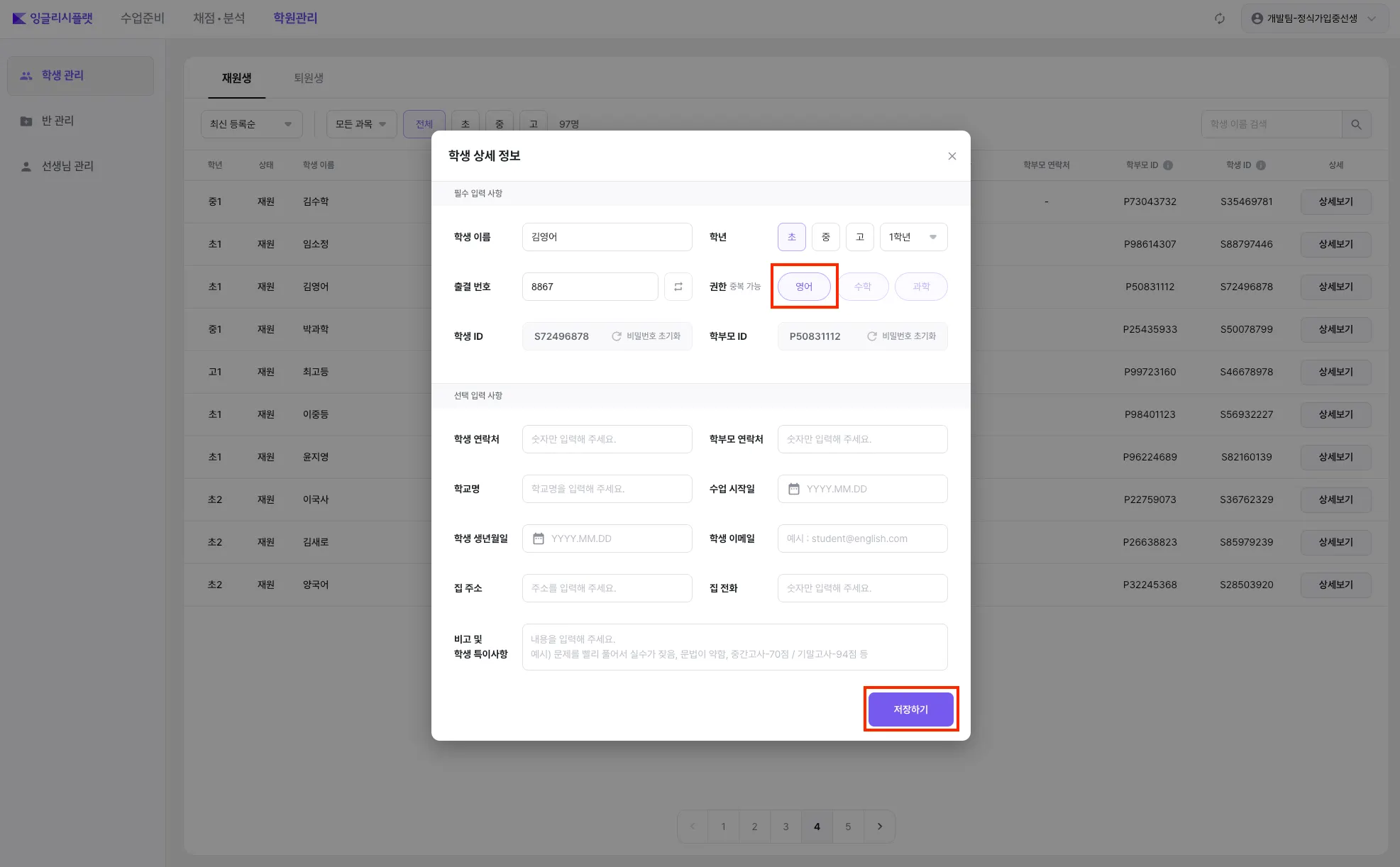 단, 새로운 학생 / 선생님을 잉글리시플랫에서도 등록하고 싶으시다면, 매쓰플랫에서 등록하시면 잉글리시플랫에서도 동일하게 적용됩니다.