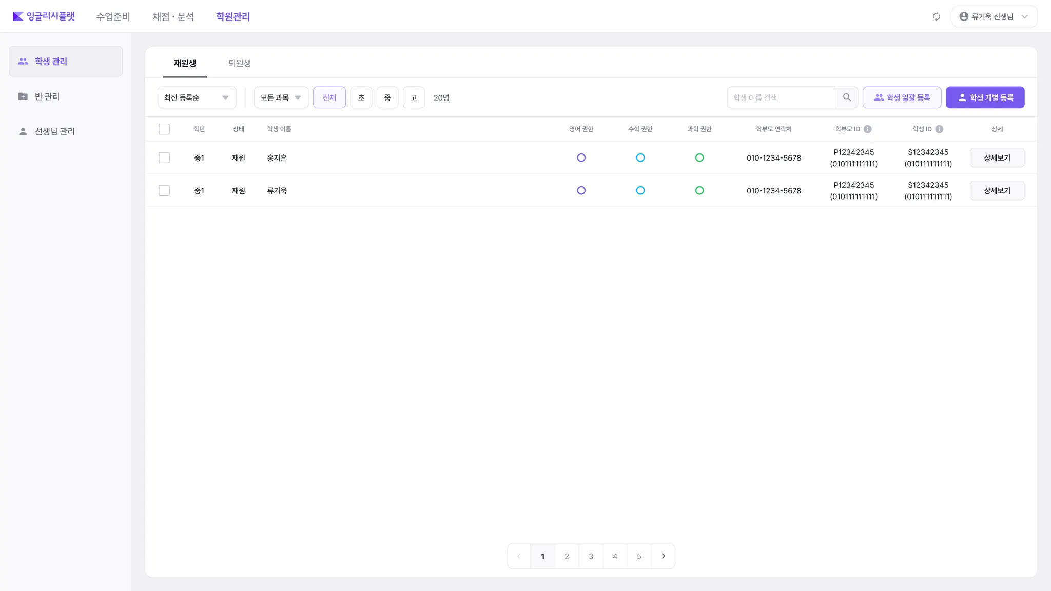 좌측 메뉴에서 “학생 관리”를 선택하여, 학생 목록을 확인할 수 있습니다.