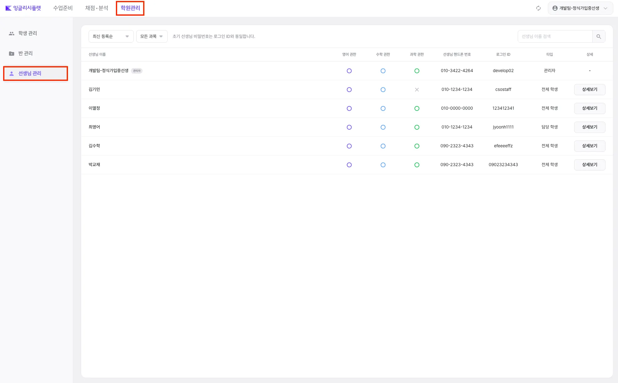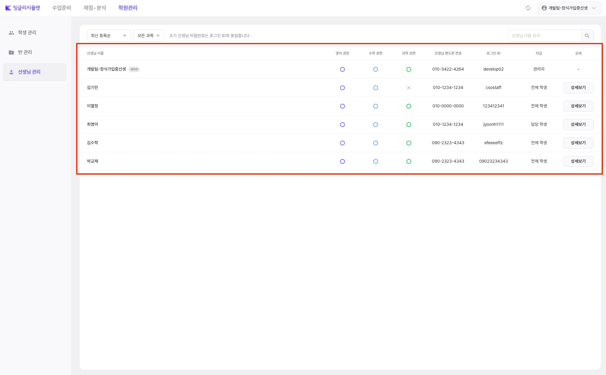 좌측 메뉴에서 “선생님 관리”를 선택하여, 선생님 목록을 확인할 수 있습니다.