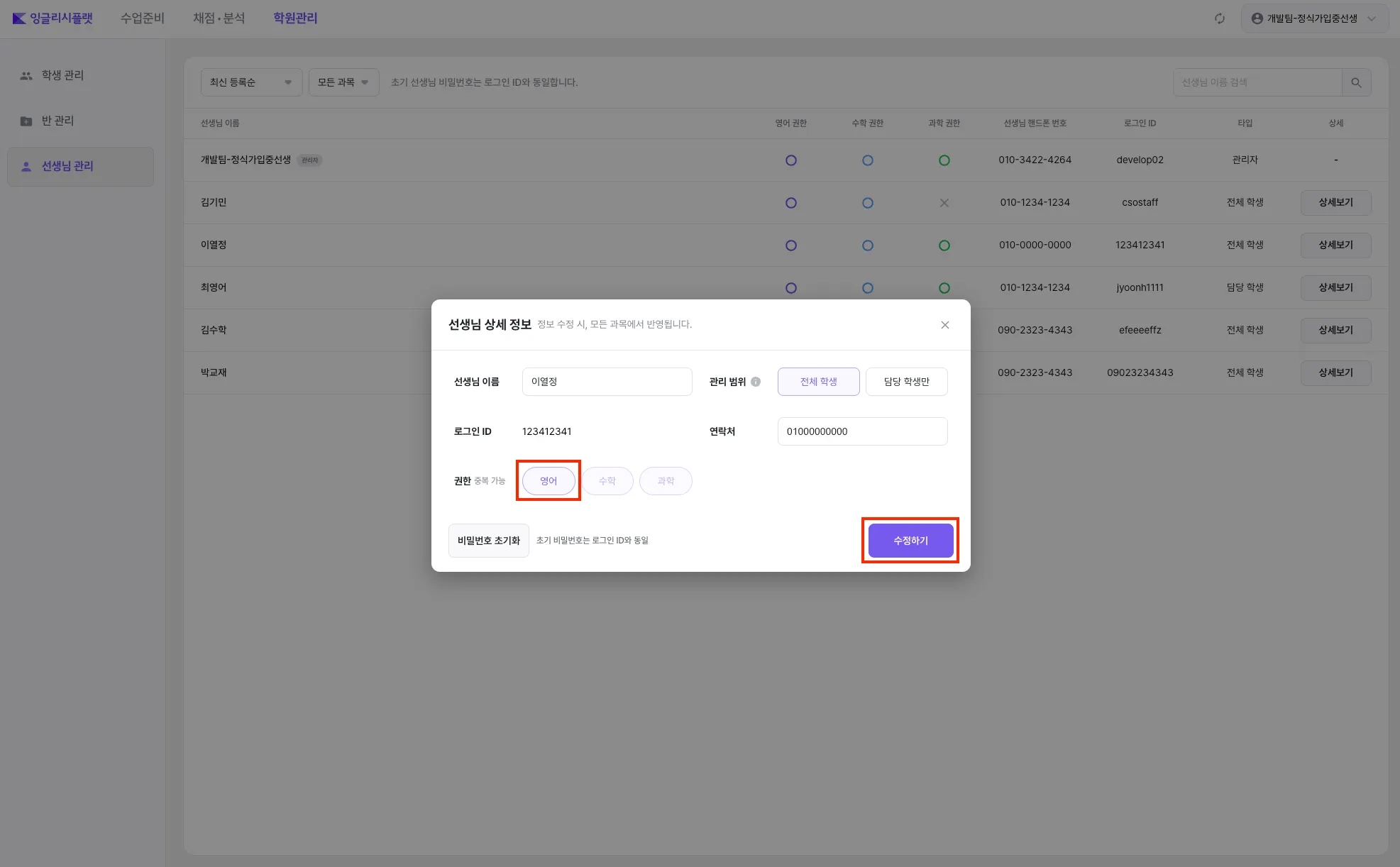 “영어 권한”이 있는 선생님만 “영어 선생님앱”에 로그인하여 사용할 수 있습니다.
