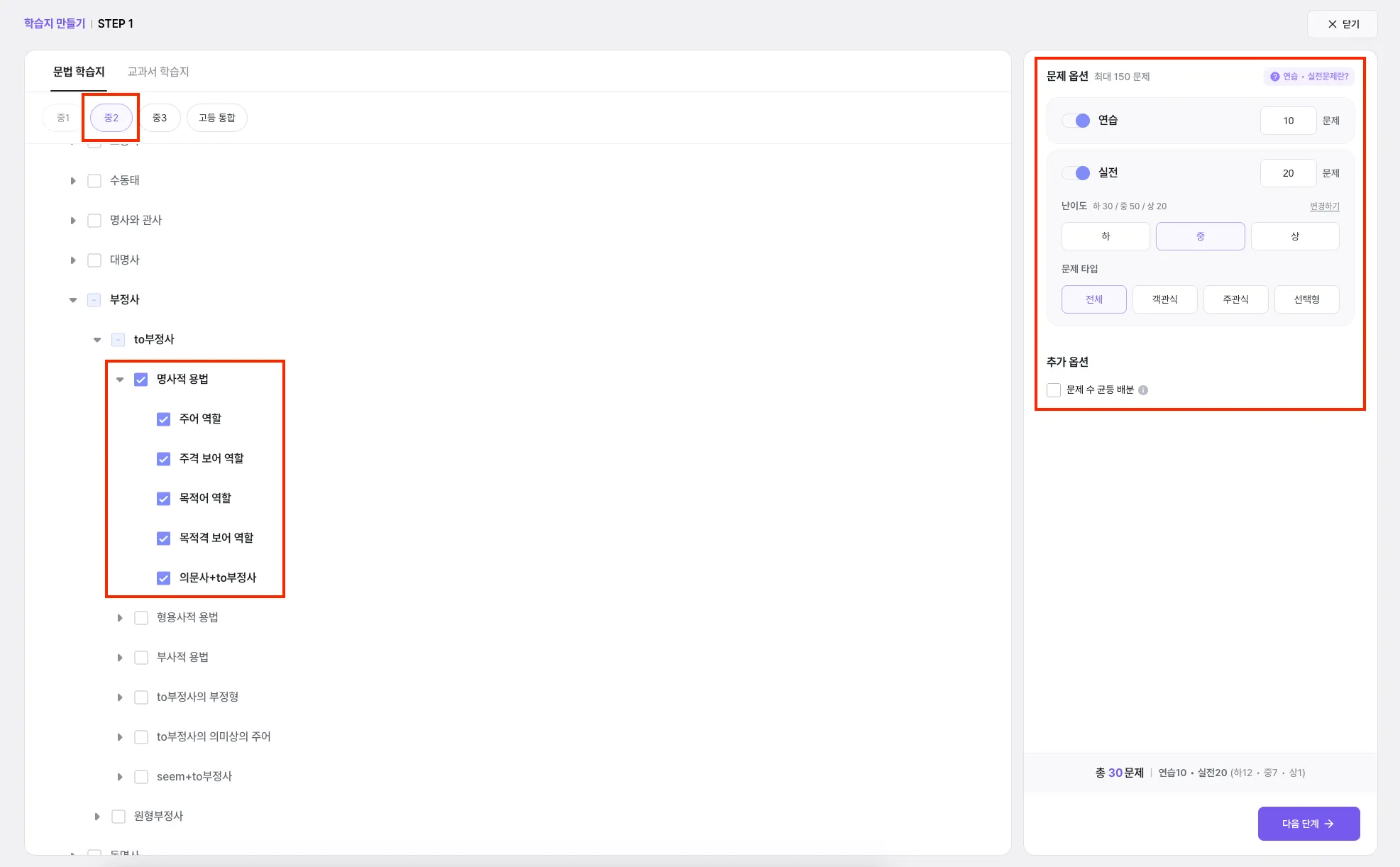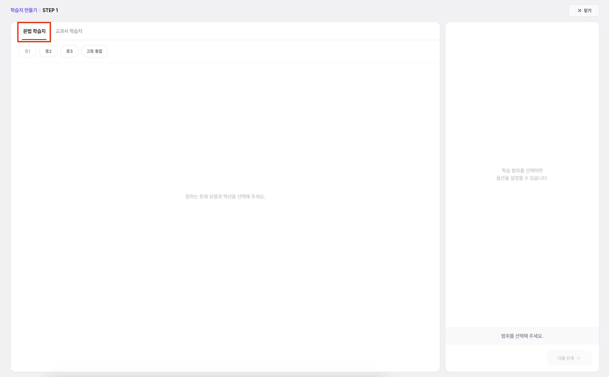 학습지에 포함할 문법 범위를 선택해주세요.