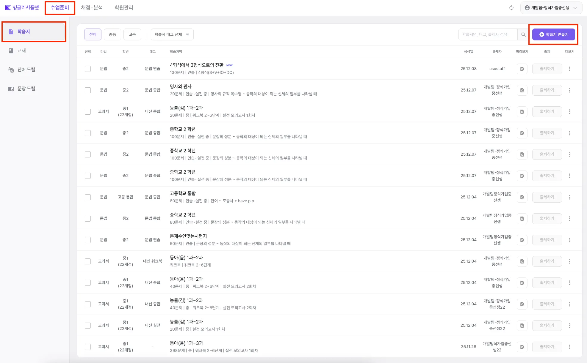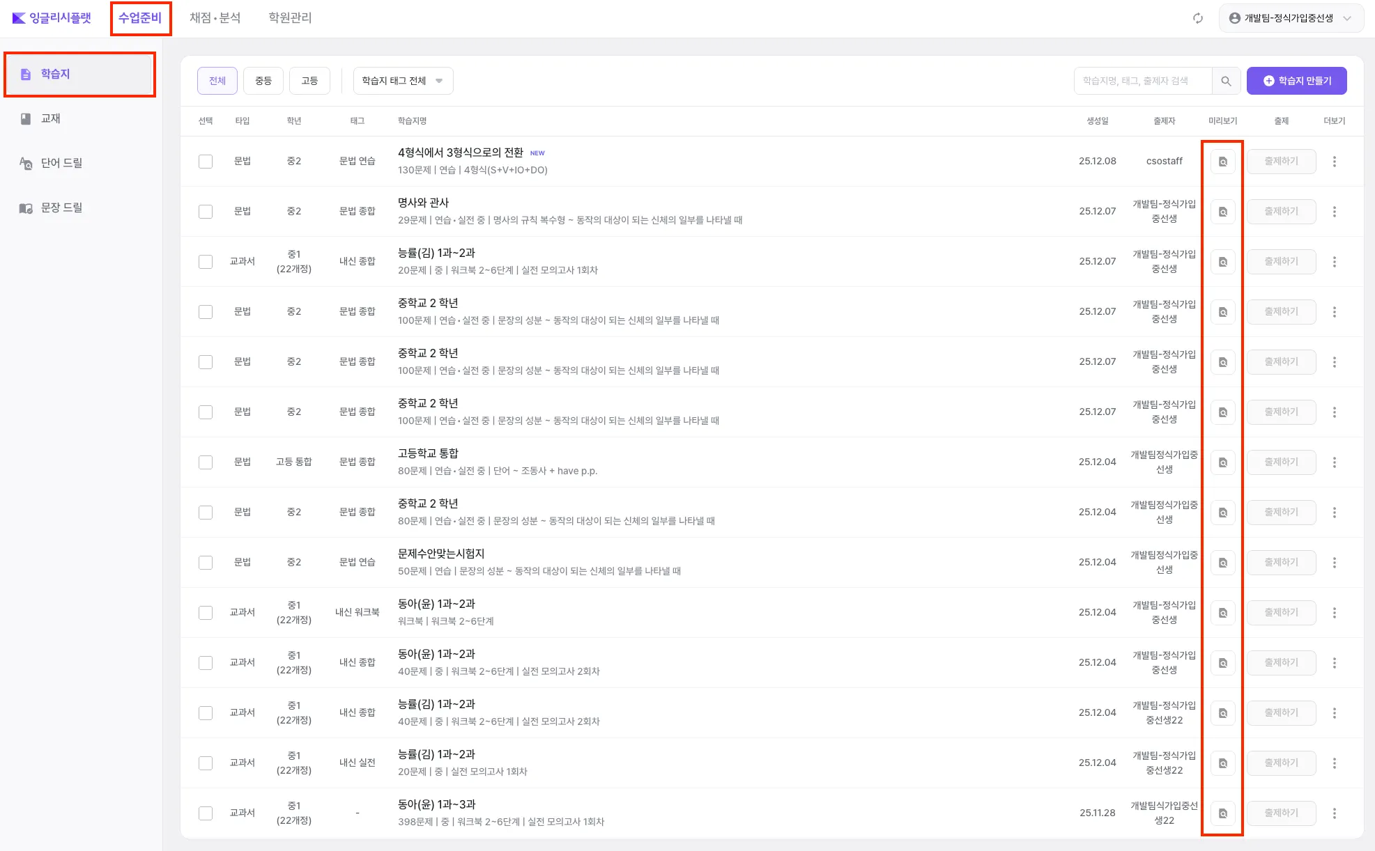 [수업준비] → [학습지] 메뉴로 들어갑니다.