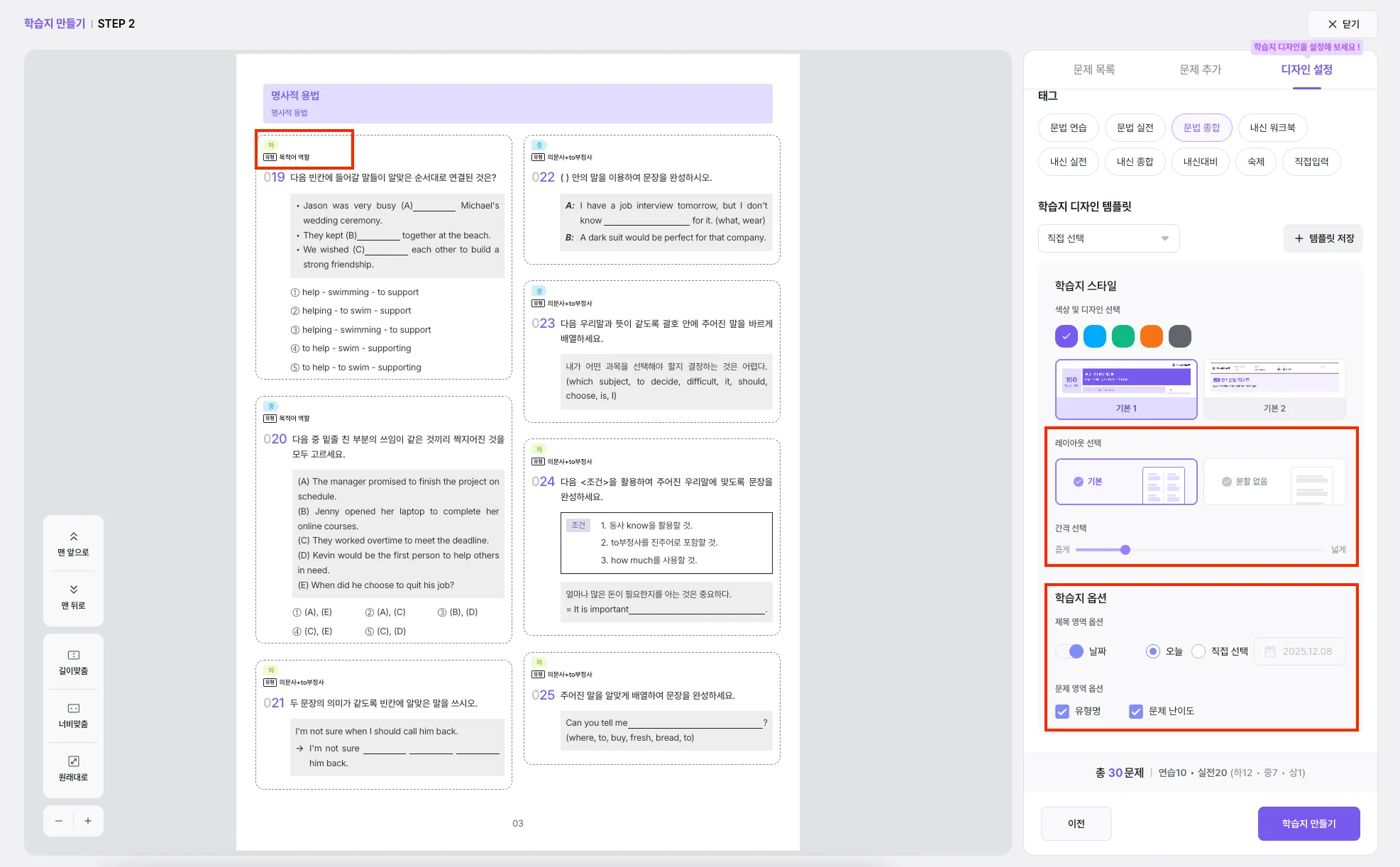 학습지 레이아웃과 문제 간 간격을 조절할 수 있어요.