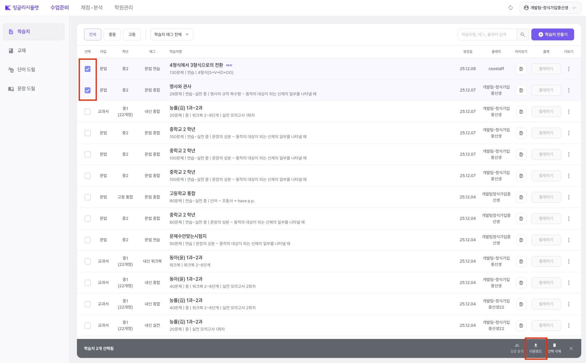 원하는 학습지(들)을 선택해, 하단의 ‘다운로드’ 버튼을 눌러주세요.