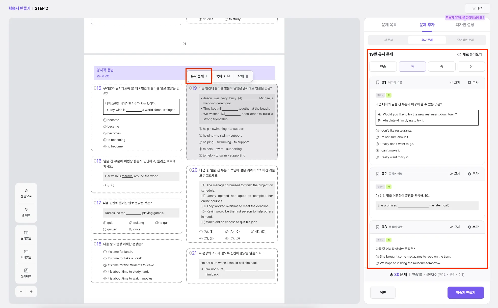 유사 문제는 선택한 문제 바로 다음 번호로 추가됩니다.