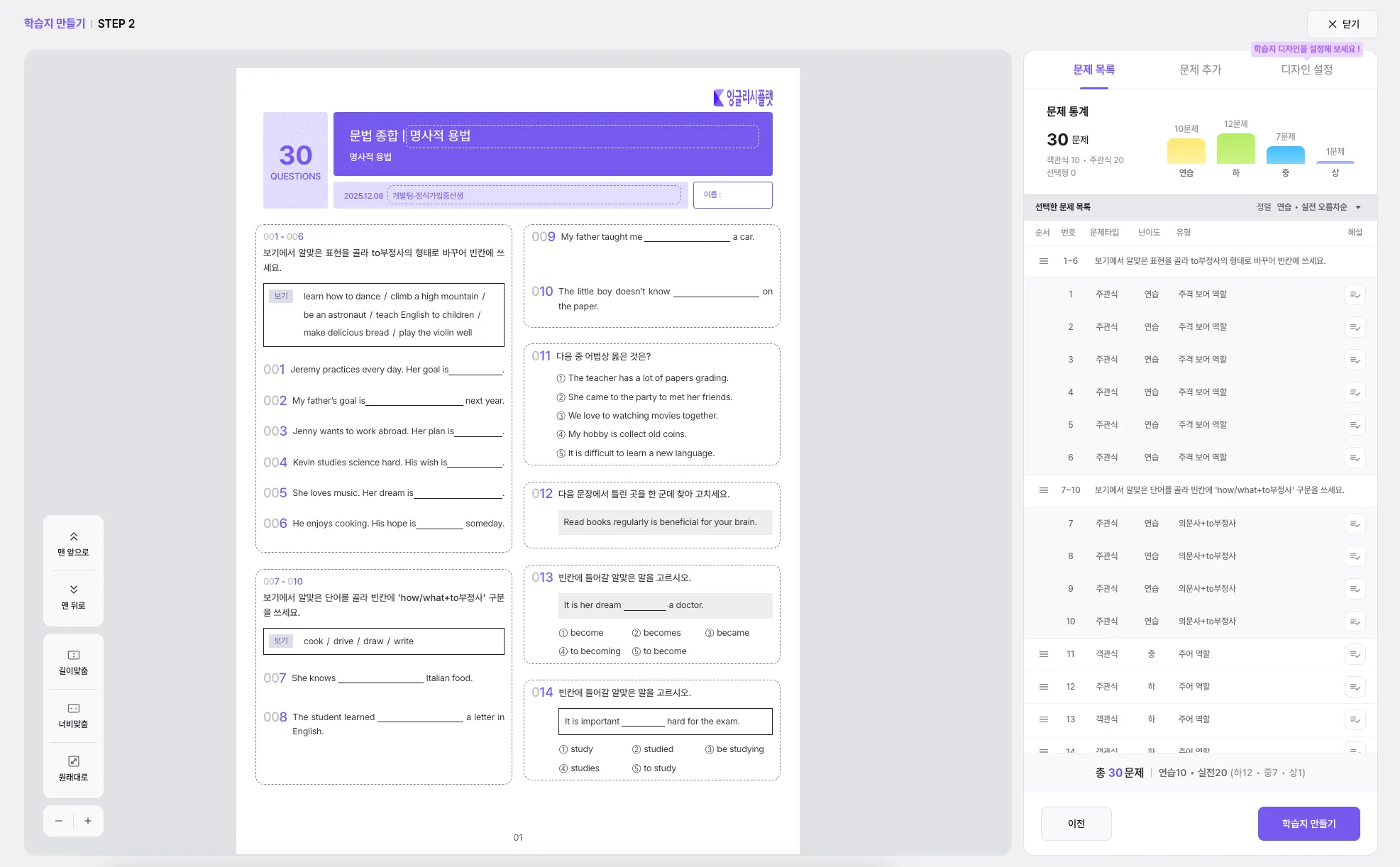 왼쪽 영역에서는 실제로 인쇄될 학습지 형태로 확인할 수 있어요.