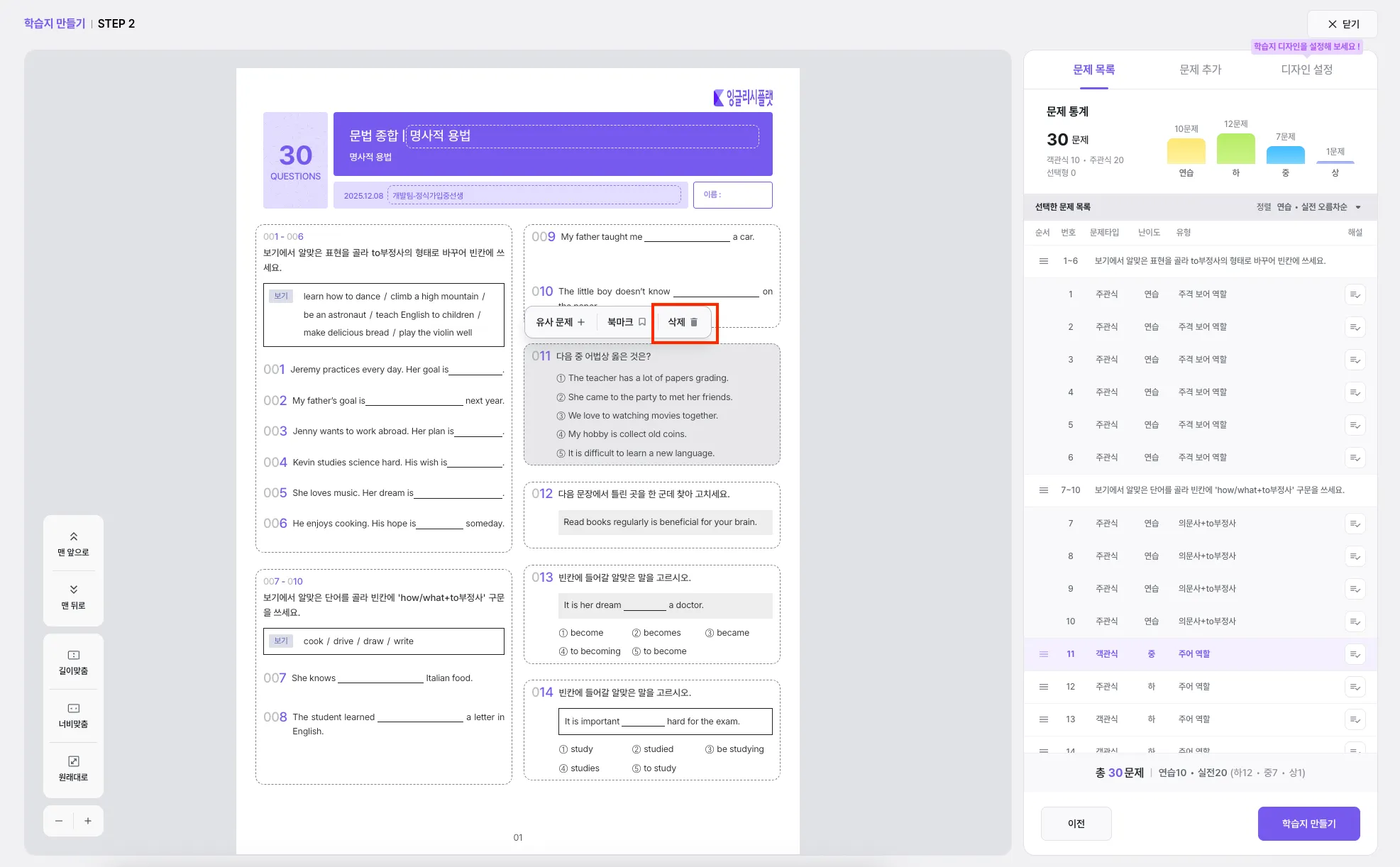 왼쪽 영역에서 문제를 선택 후, ‘삭제’ 버튼을 눌러 문제를 지울 수 있어요.
