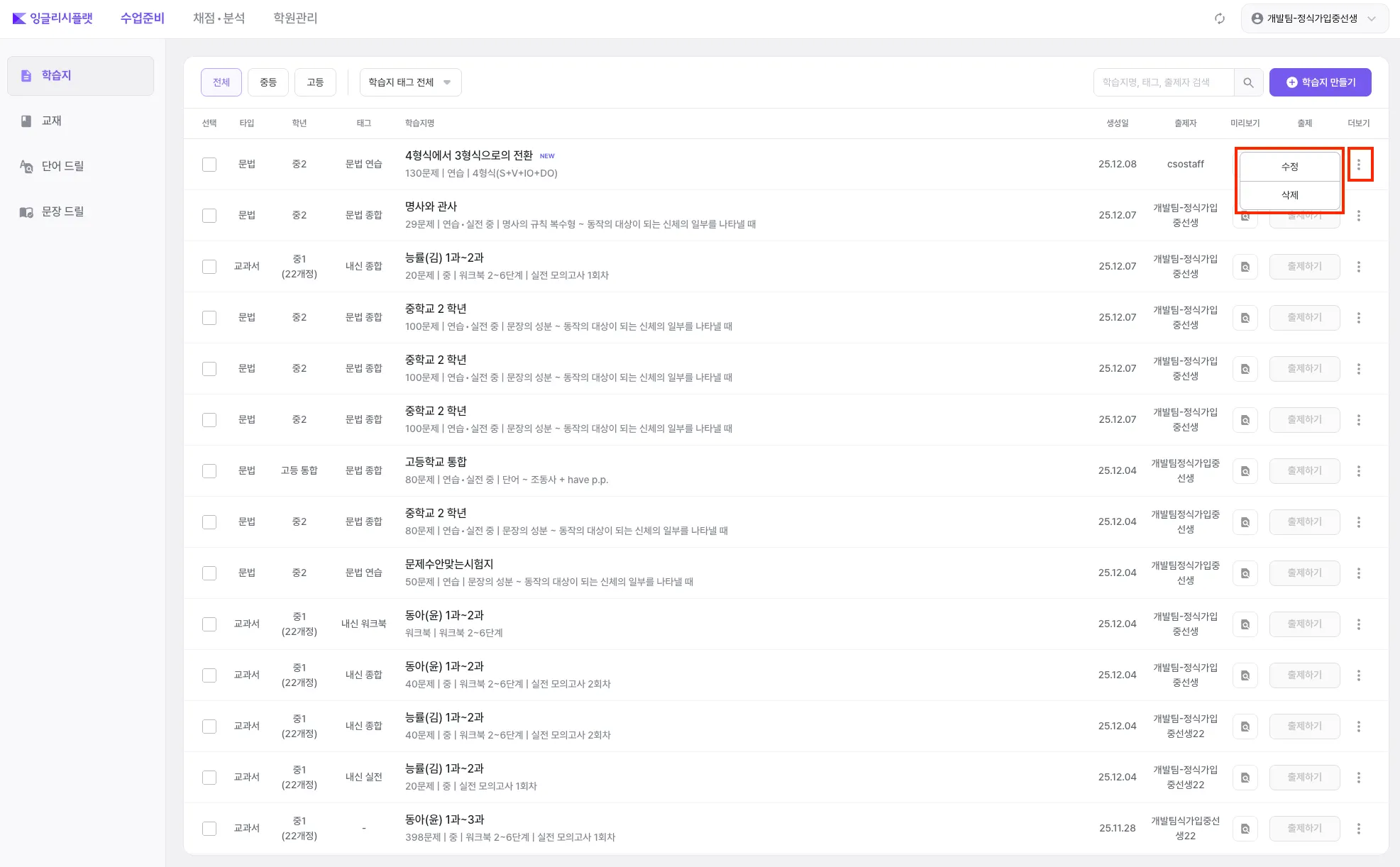 ‘수정’을 눌러서 학습지를 수정할 수 있어요.