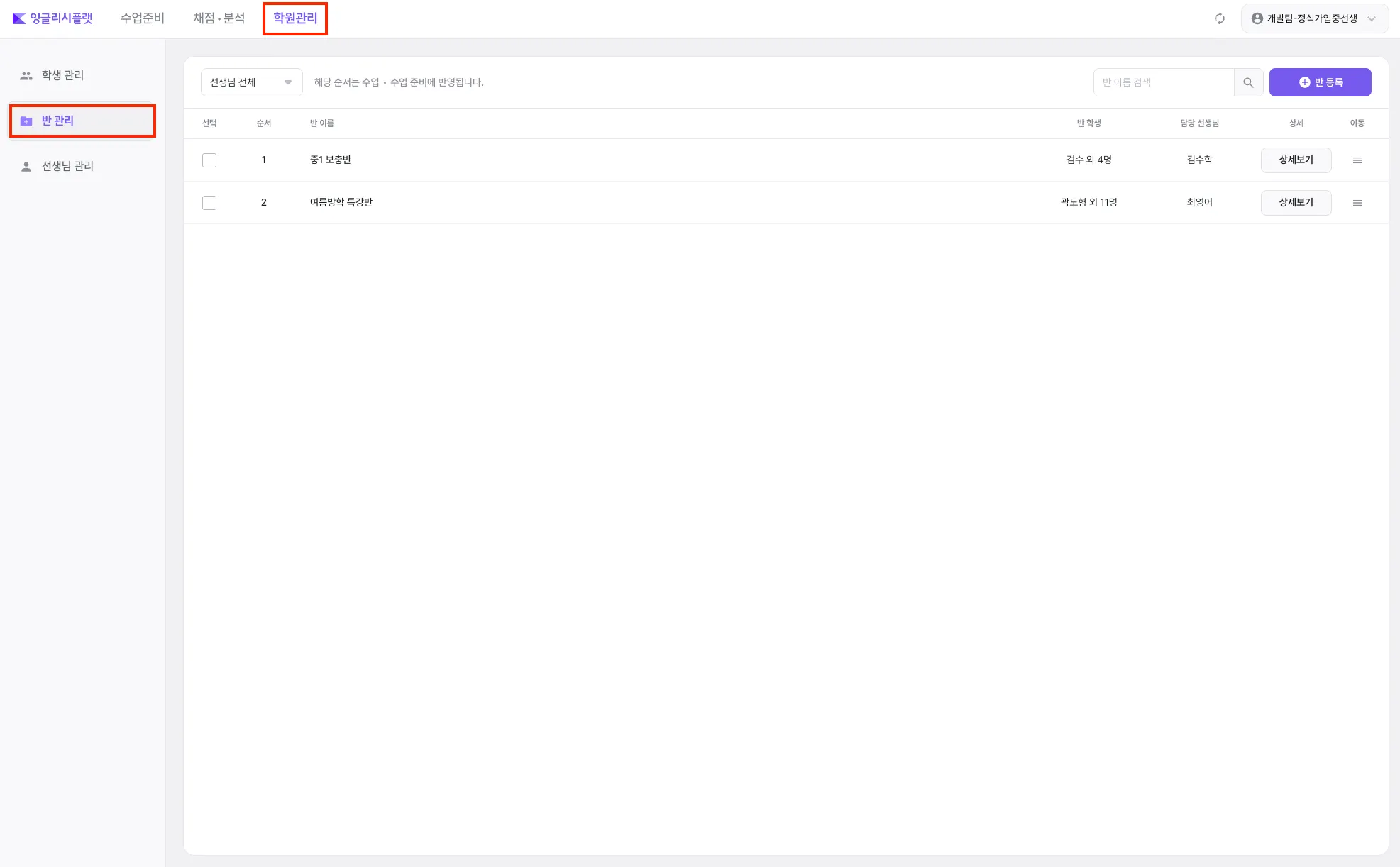 좌측 메뉴에서 “반 관리”를 선택하여, 반 목록을 확인할 수 있습니다.