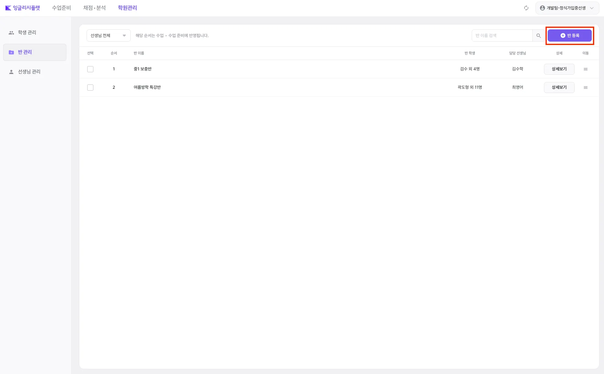 ‘반 등록’ 버튼을 눌러 반을 등록할 수 있습니다.