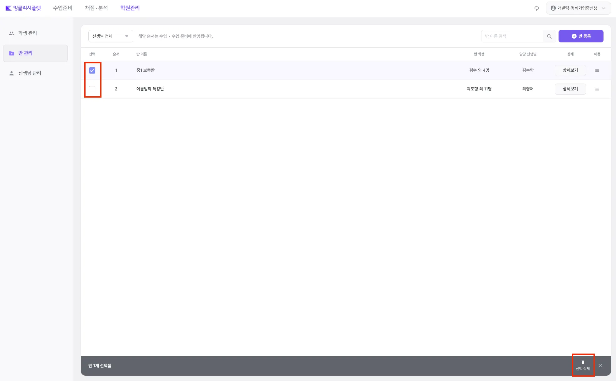 반을 선택하여, 삭제할 수 있습니다.