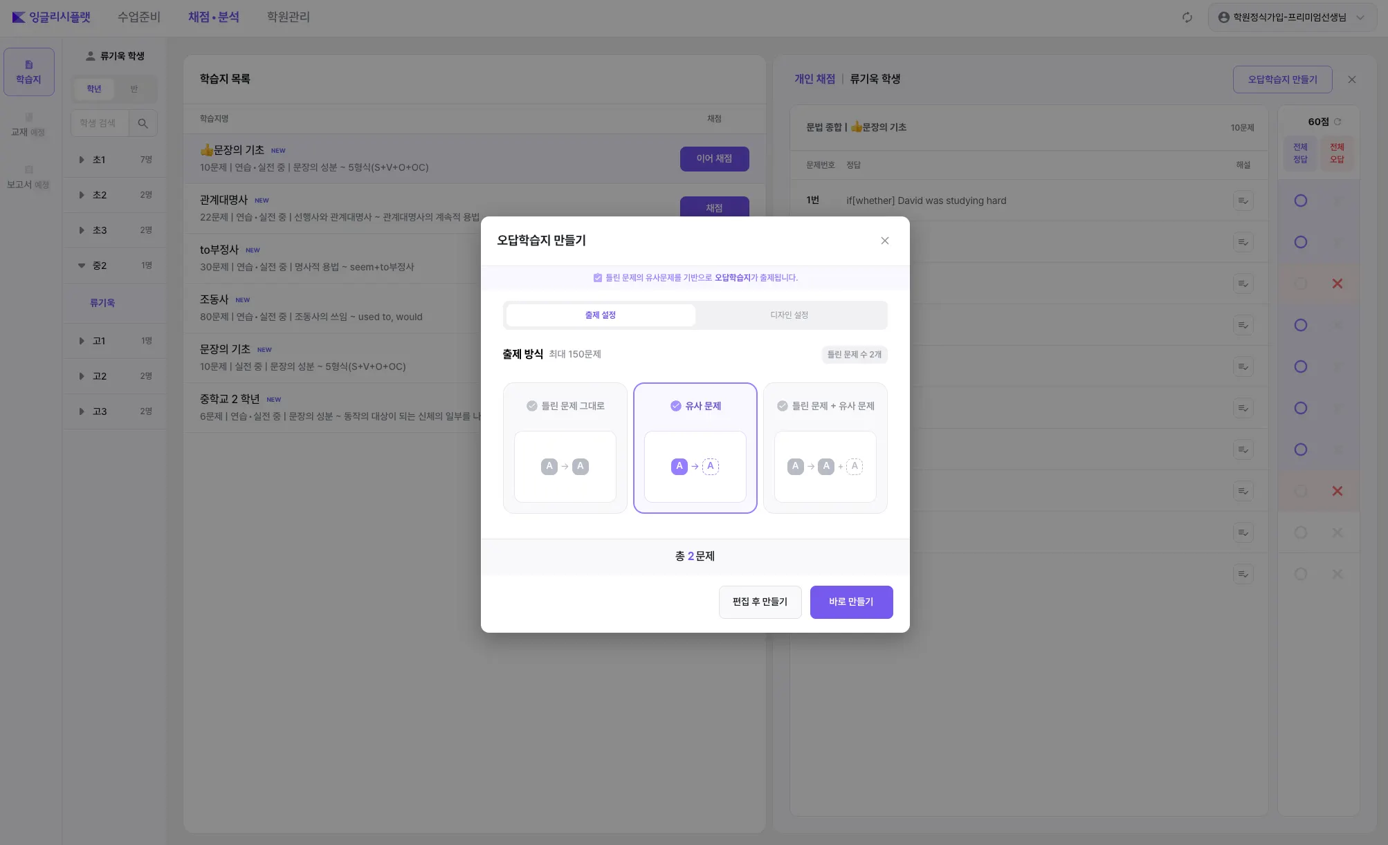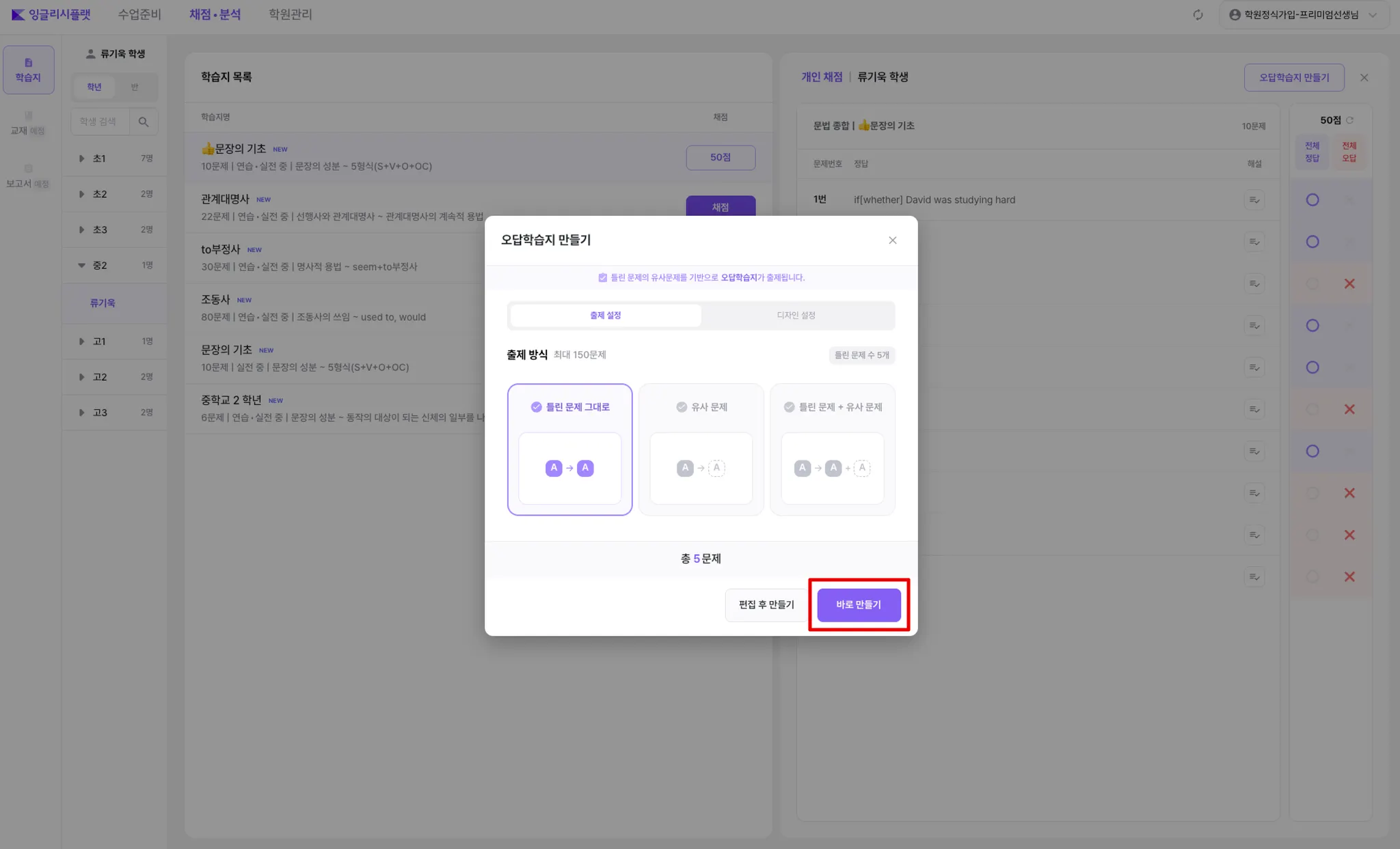 “바로 만들기” 버튼을 눌러서 추천된 문제 그대로 바로 오답학습지를 만듭니다.