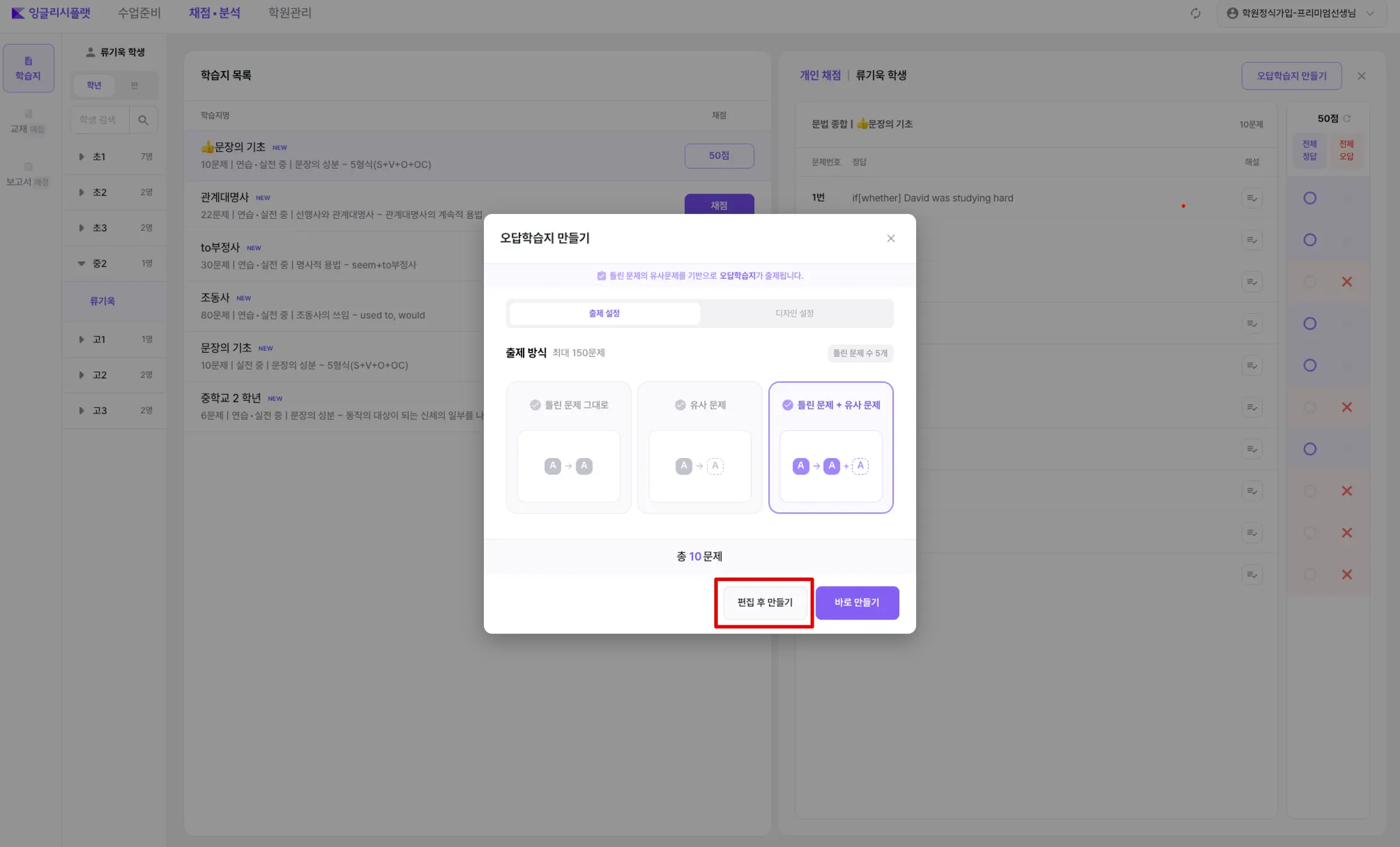 2. 학생 개별 ‘오답학습지 만들기’ 버튼 누르기