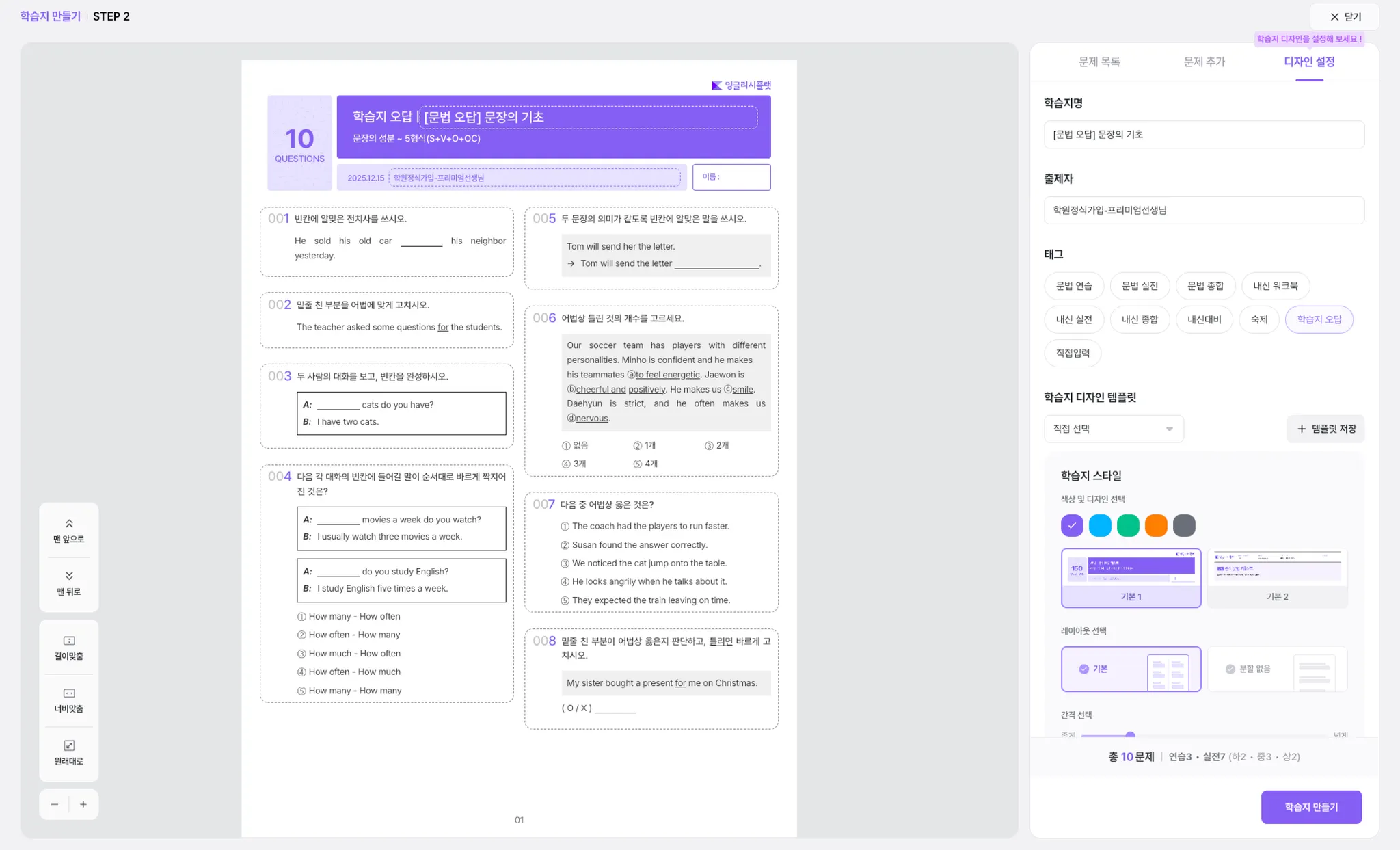 원하는 범위의 문법 학습지를 3분 안에 만들 수 있어요.