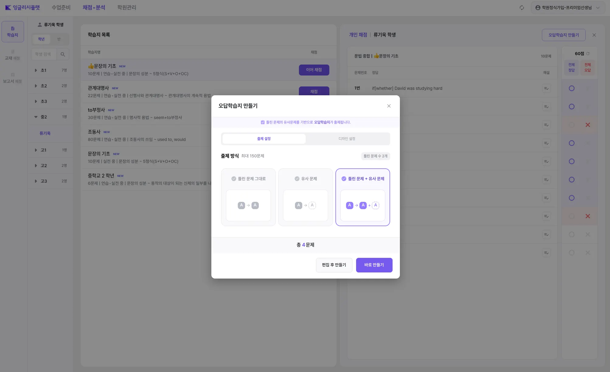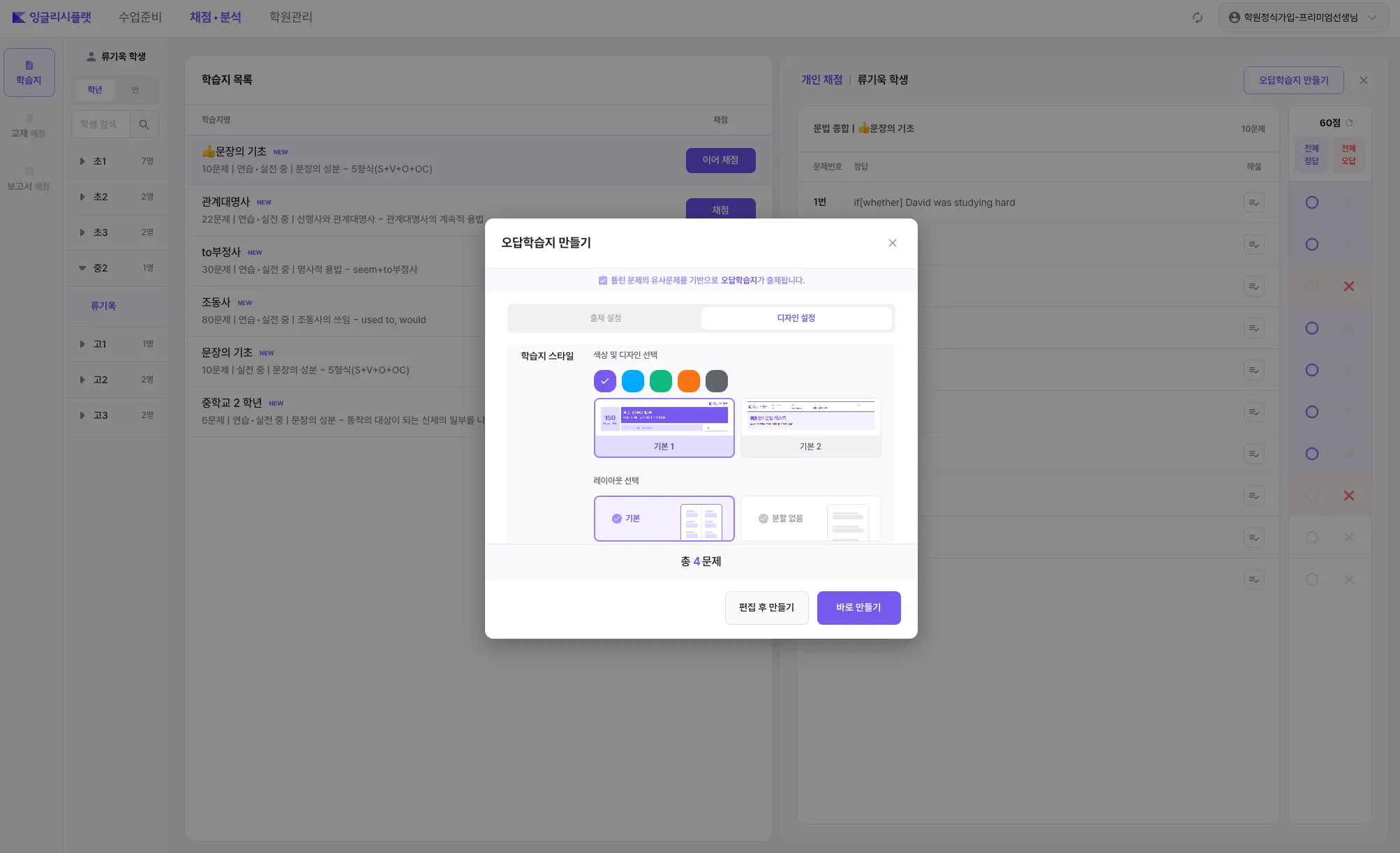 오답학습지의 디자인과 레이아웃을 설정 후 만들 수 있습니다.