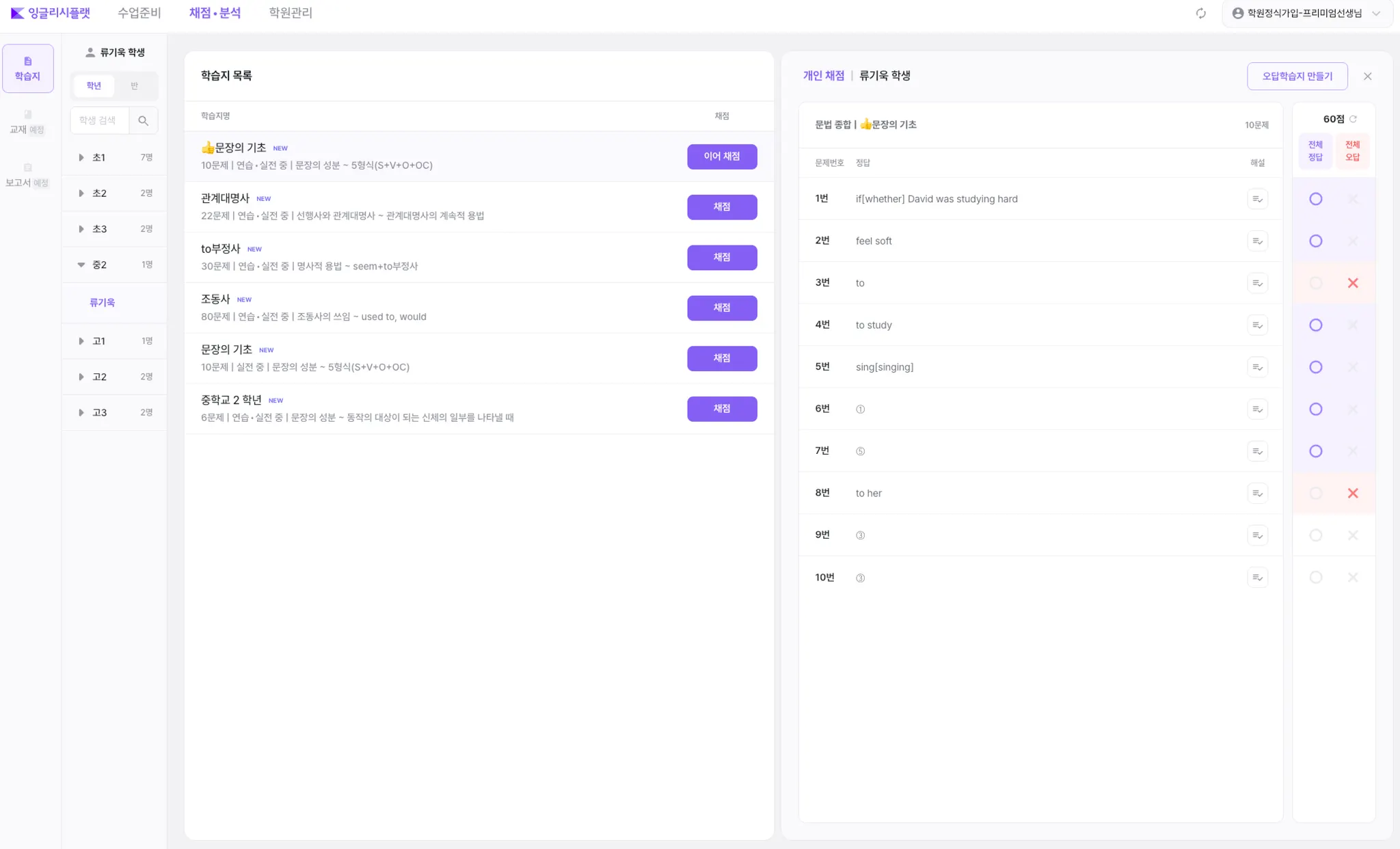 선택한 학생에게 출제된 학습지를 선택하여 채점을 마칩니다.