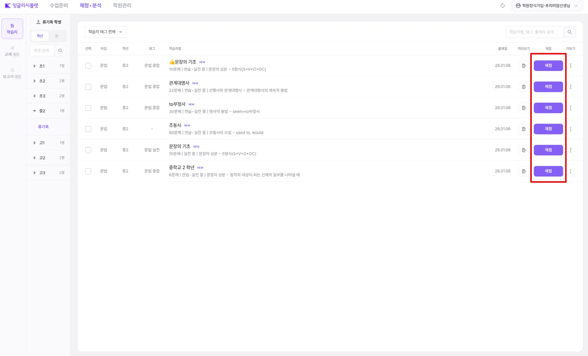 채점할 학습지의 ‘채점’ 버튼을 누릅니다.
