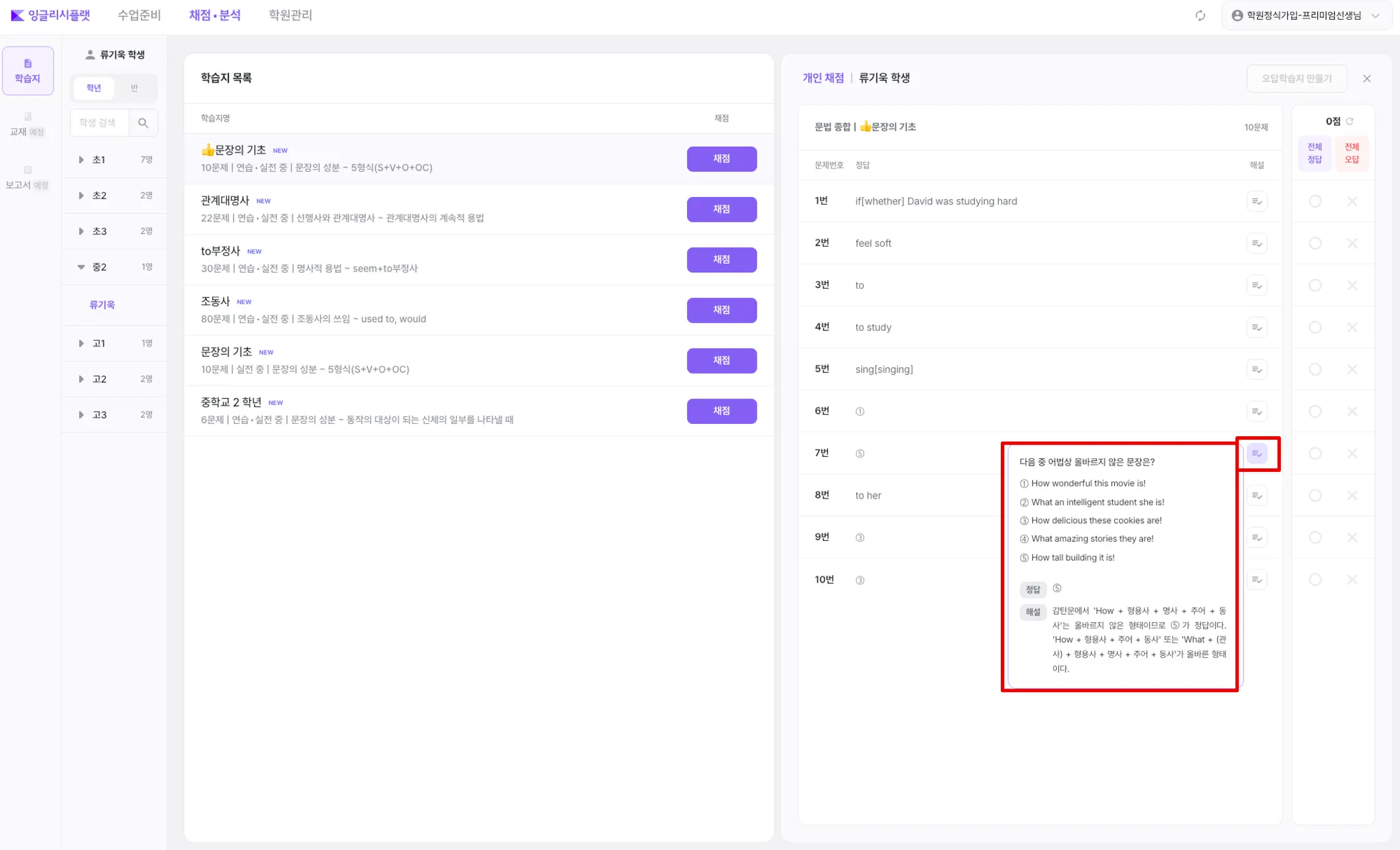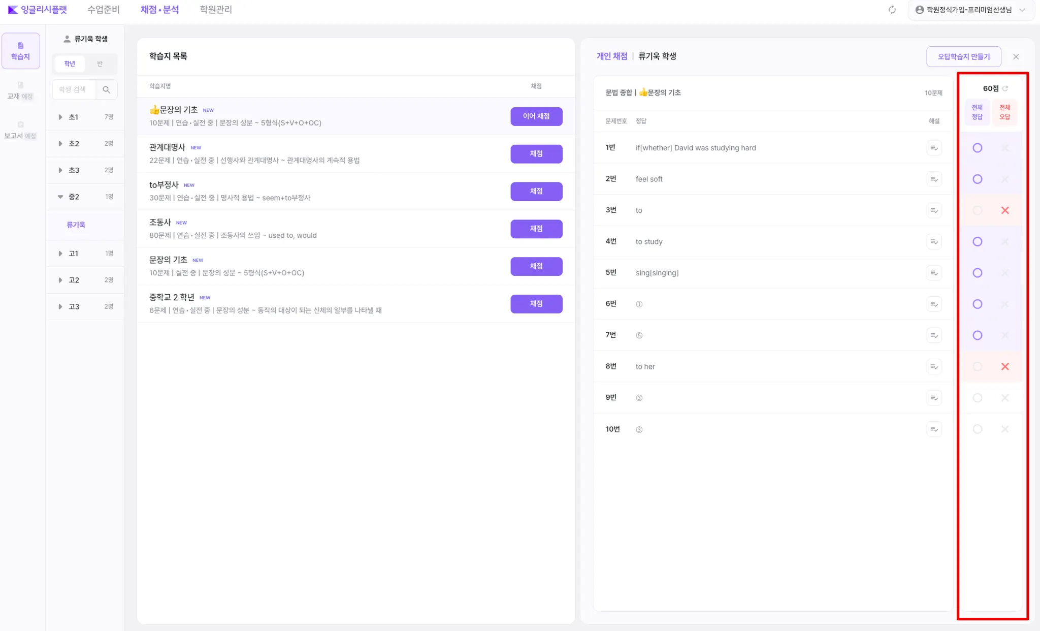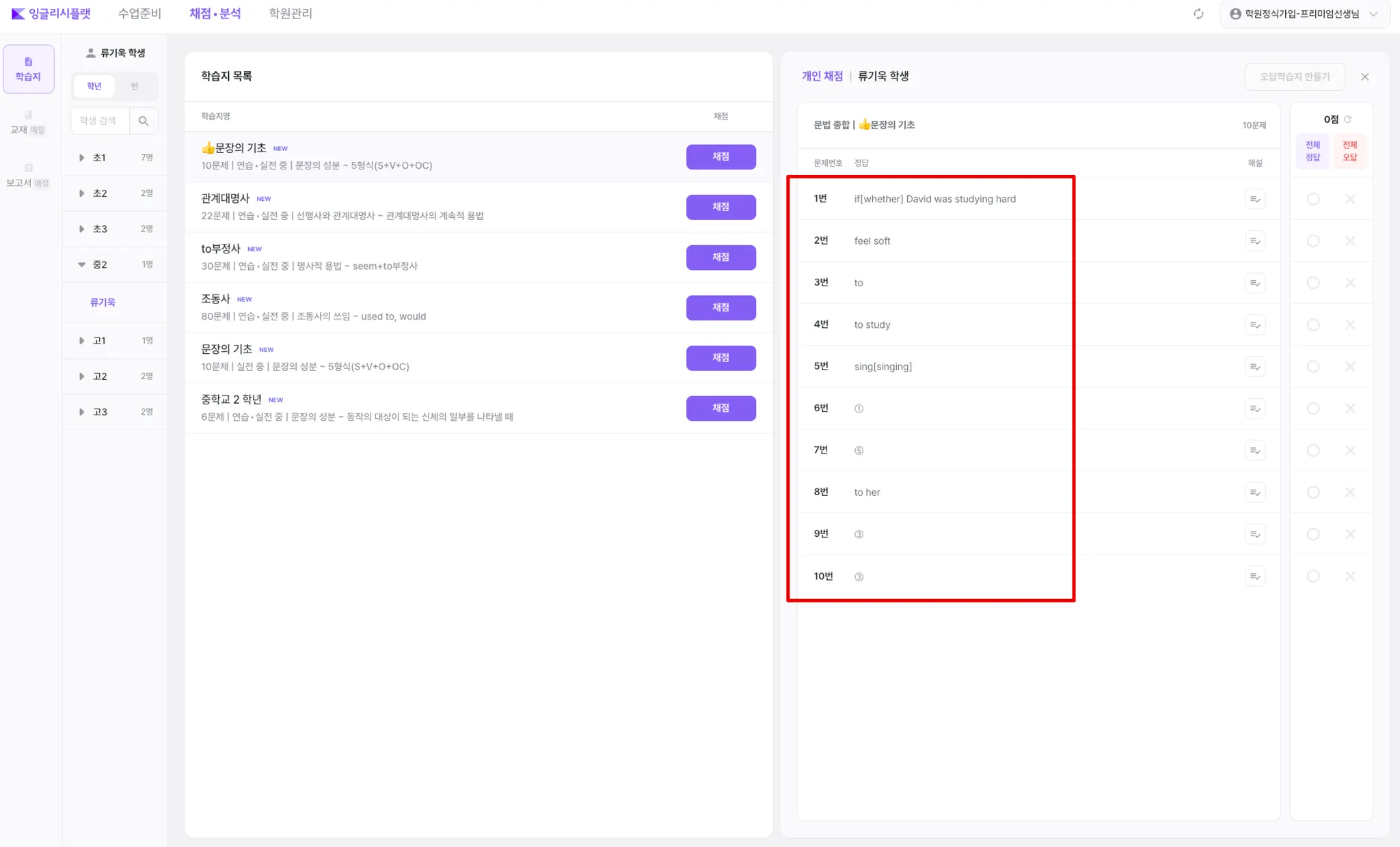 좌측 학생 리스트에서 채점할 ‘학생’을 선택합니다.