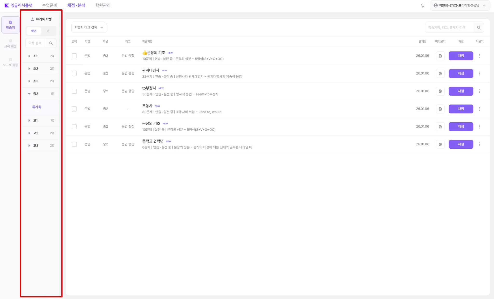 1. ‘채점•분석’ → ‘학습지’ 진입하기