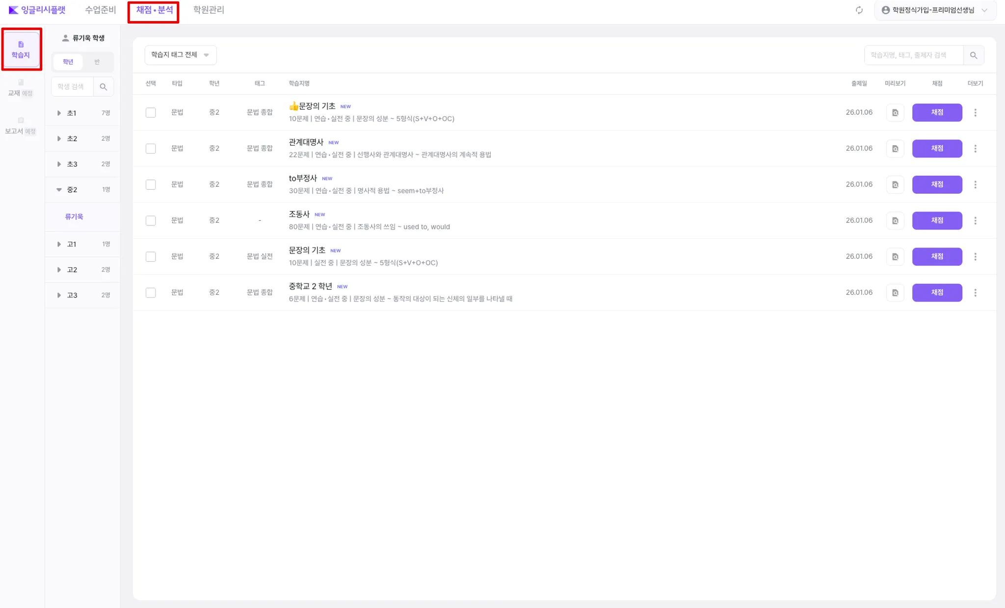 [채점•분석] → [학습지]로 들어갑니다.